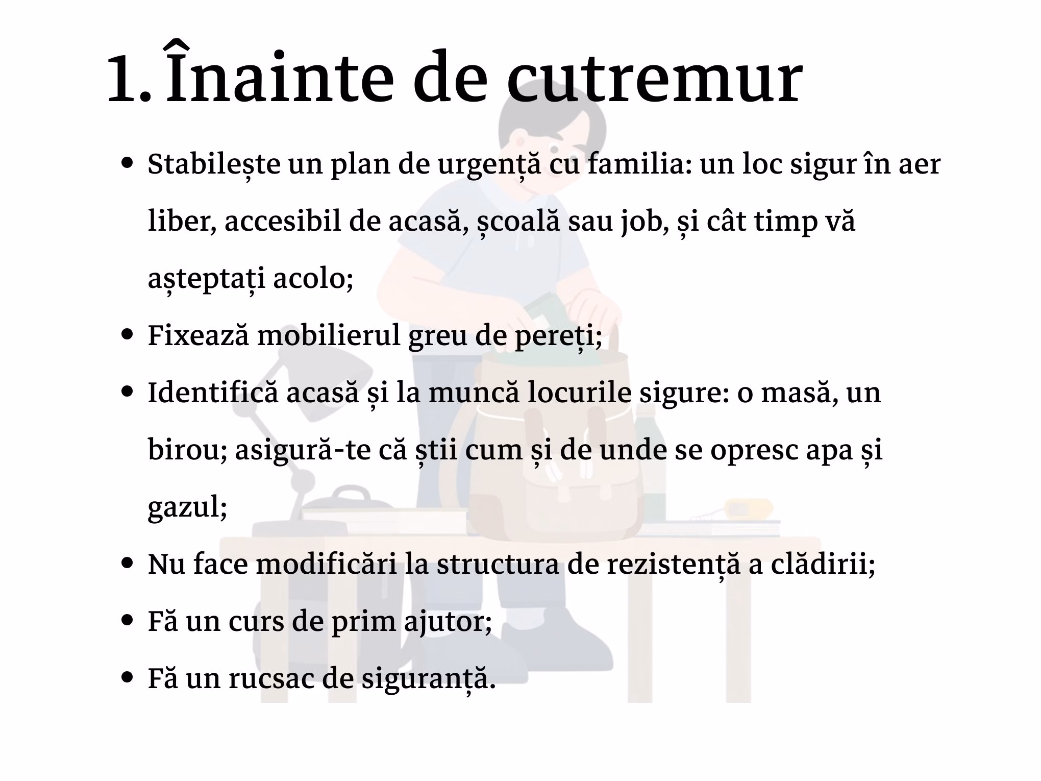 - Identifică acasă și la muncă locurile sigure: o masă, un birou; asigură-te că știi cum și de unde se opresc apa și gazul;