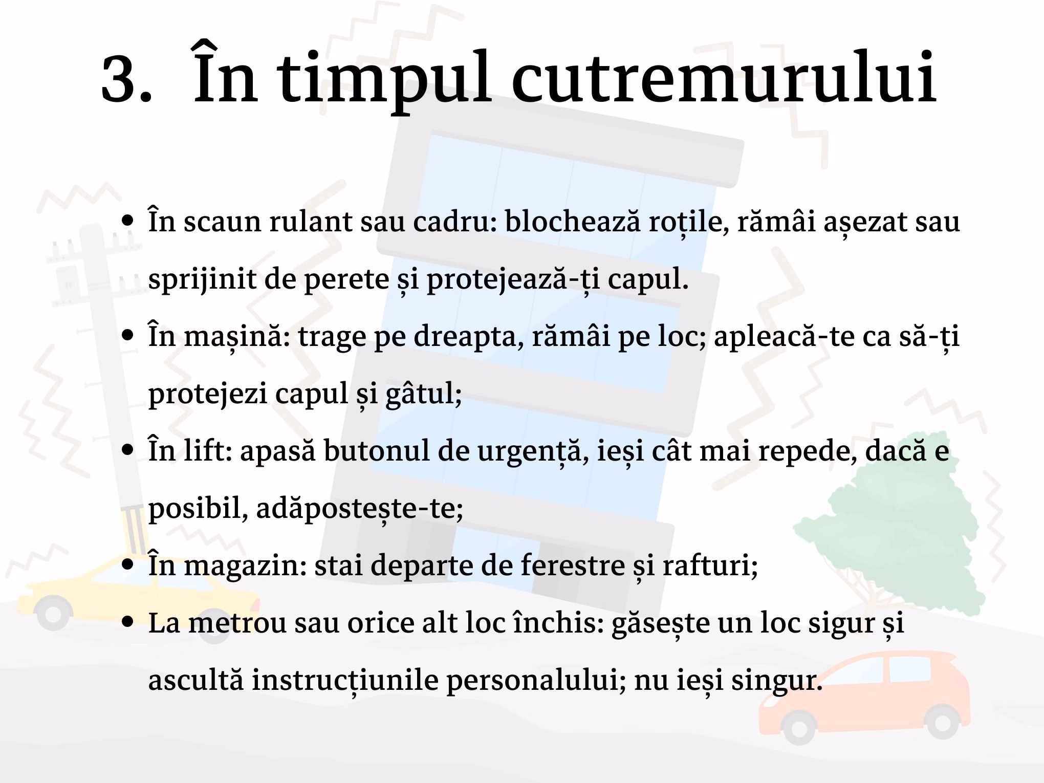 - În lift: apasă butonul de urgență, ieși cât mai repede, dacă e posibil, adăpostește-te;