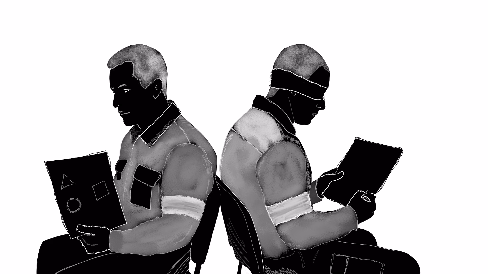 Doi pompieri stau spate în spate, în sala largă a Asociației Nevăzătorilor din România. Unul studiază o foaie cu forme geometrice. Le descrie. Partenerul desenează după vocea lui: ezită, se oprește când explicațiile vin rapid sau prea tehnic.