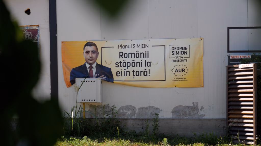 „Românii, stăpâni la ei în țară!”, scrie pe un afiș cu George Simion, liderul partidului AUR, lipit pe o clădire din Curcani. E tot aici la câteva luni de la încheierea alegerilor prezidențiale.