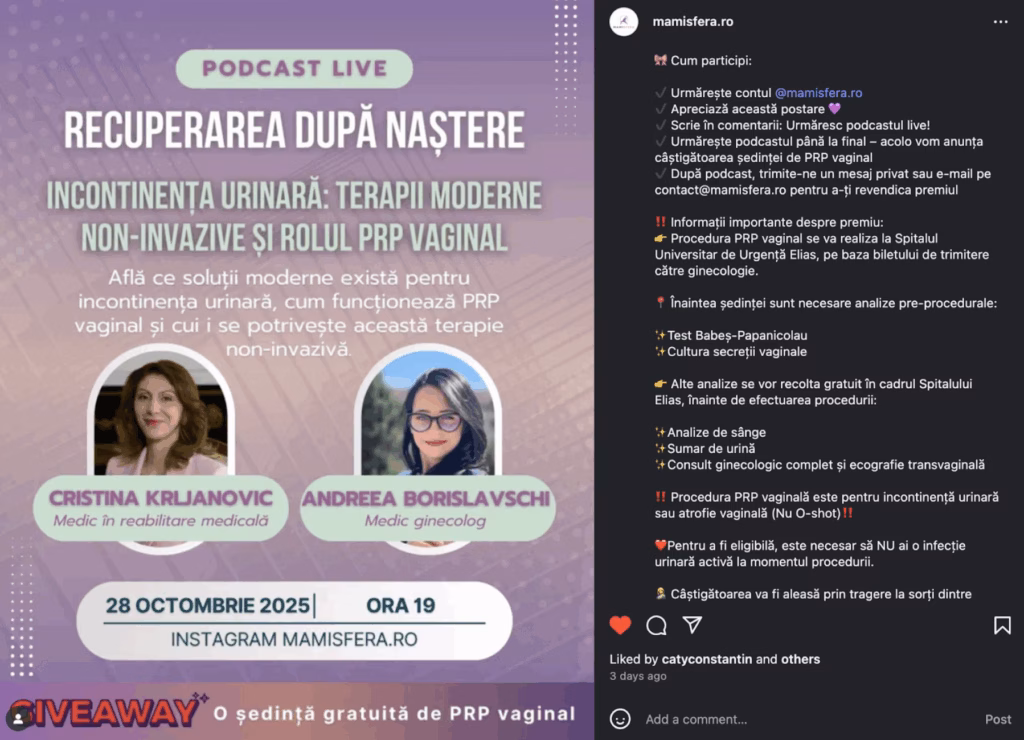 Printre ele, o pagină a unei clinici de recuperare după naștere a plătit ca să-i împingă algoritmii o postare despre un podcast. Tema: incontinența urinară și rolul PRP vaginal. Invitată, Andreea Borislavschi, medic ginecolog la Spitalul Elias, în secția condusă de doctorul Radu Vlădăreanu, un nume cu greutate în ginecologia din România. Ca să încurajeze participarea, există și un premiu special: Giveaway pentru o norocoasă participantă – o ședință gratuită de PRP vaginal la Spitalul Elias, instituție medicală administrată de Academia Română.