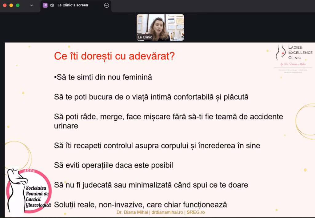 Webinarul se cheamă Recâștigă-ți feminitatea și e organizat într-o seară de la finalul lui octombrie 2025 de Ladies Excellence Clinic by Dr. Diana Mihai.