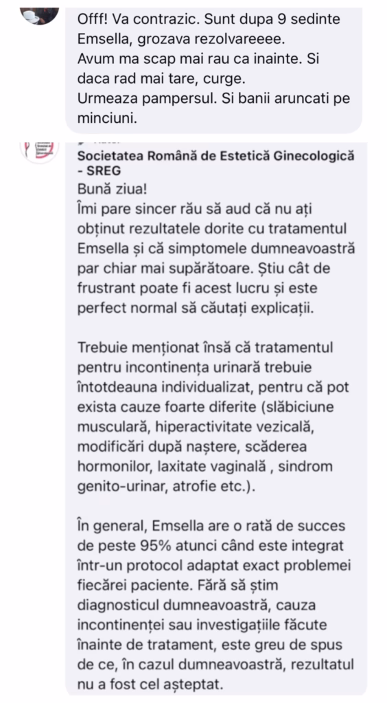 Ioana a ajuns și ea la același doctor pentru aceeași procedură, o combinație de TECAR cu O-Shot. O contaminase entuziasmul de început al Ilincăi*, cu care e prietenă bună. „A fost extrem de dureros și n-a avut niciun rezultat”, rezumă Ioana amar. Nu și-a terminat nici ea pachetul de ședințe plătite în avans și voia să meargă împreună cu Ilinca* să-și ceară banii înapoi și să-l reclame pe doctor. Dar rușinea și neîncrederea că le-ar fi luat cineva în serios le-au tăiat avântul: „O să zică lumea că ești nebună”.