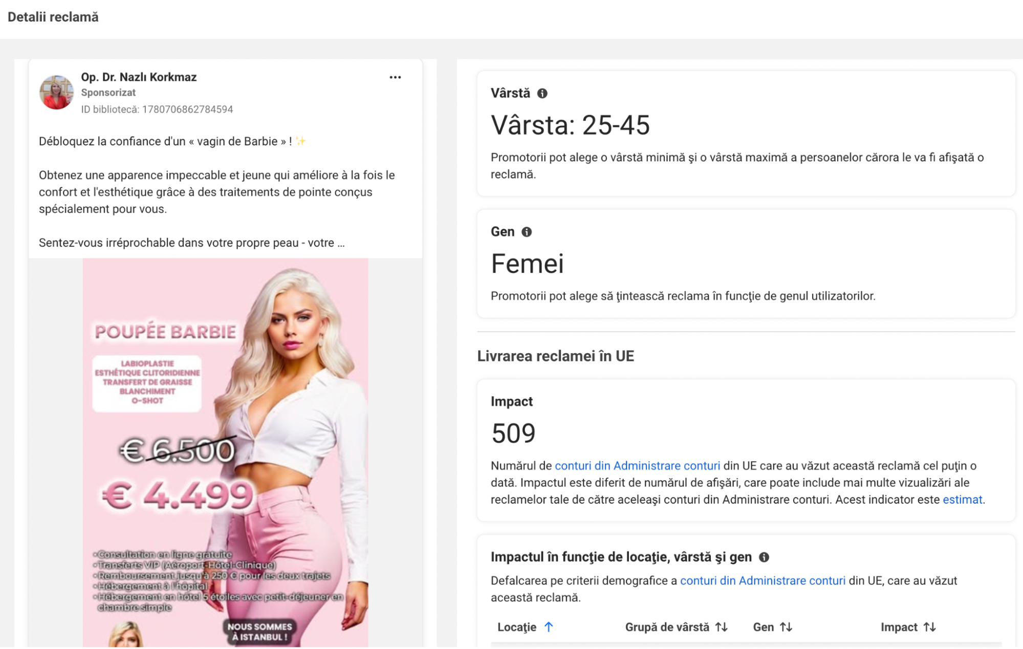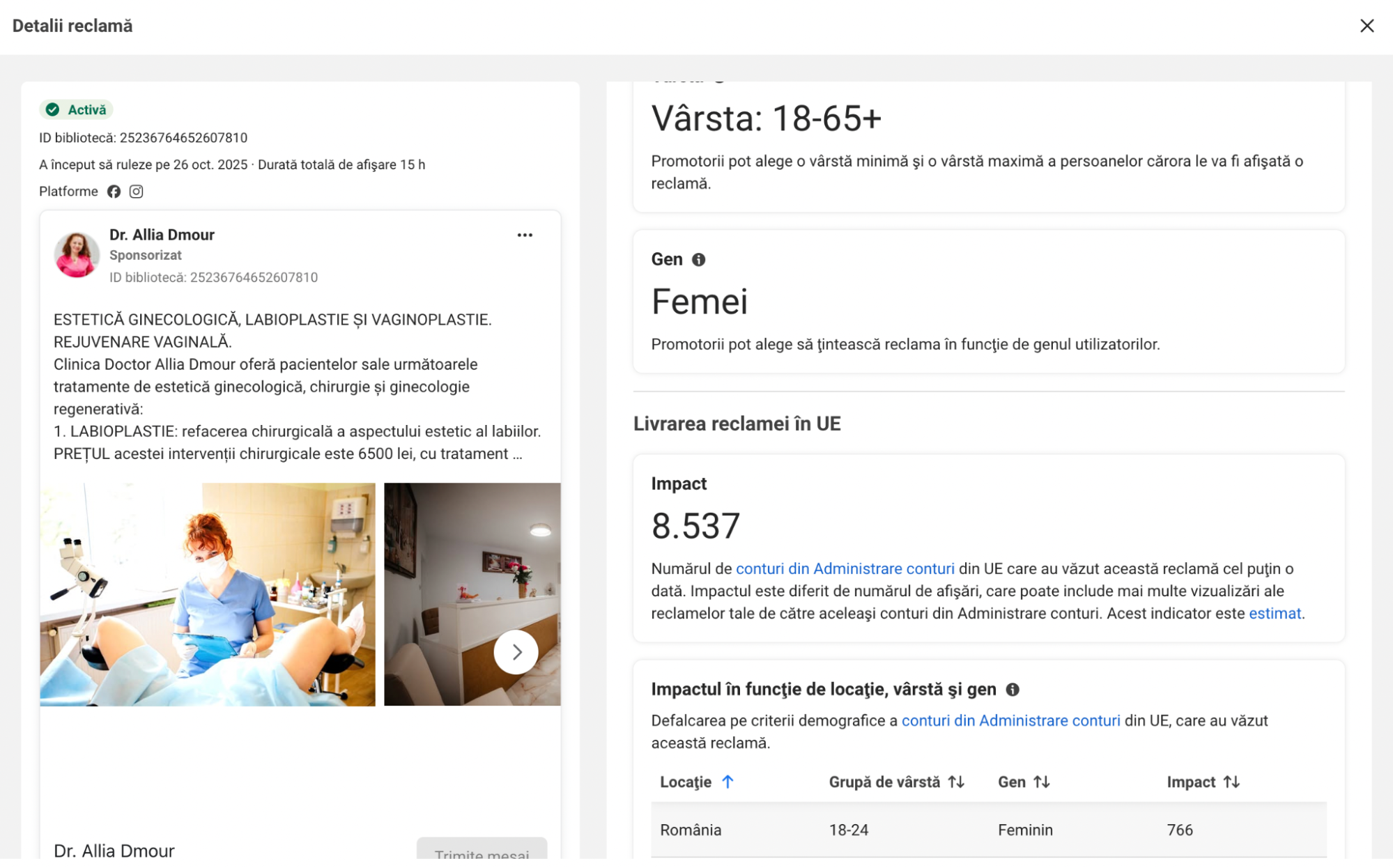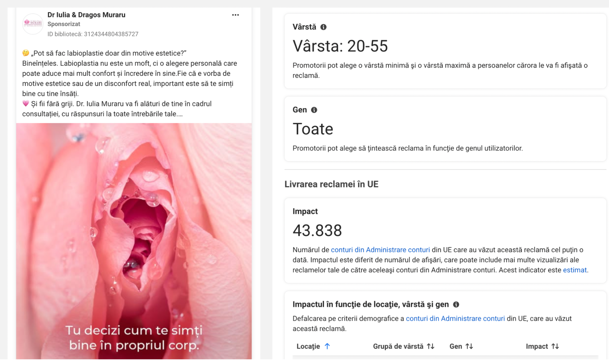 Printre ele, o pagină a unei clinici de recuperare după naștere a plătit ca să-i împingă algoritmii o postare despre un podcast. Tema: incontinența urinară și rolul PRP vaginal. Invitată, Andreea Borislavschi, medic ginecolog la Spitalul Elias, în secția condusă de doctorul Radu Vlădăreanu, un nume cu greutate în ginecologia din România. Ca să încurajeze participarea, există și un premiu special: Giveaway pentru o norocoasă participantă – o ședință gratuită de PRP vaginal la Spitalul Elias, instituție medicală administrată de Academia Română.
