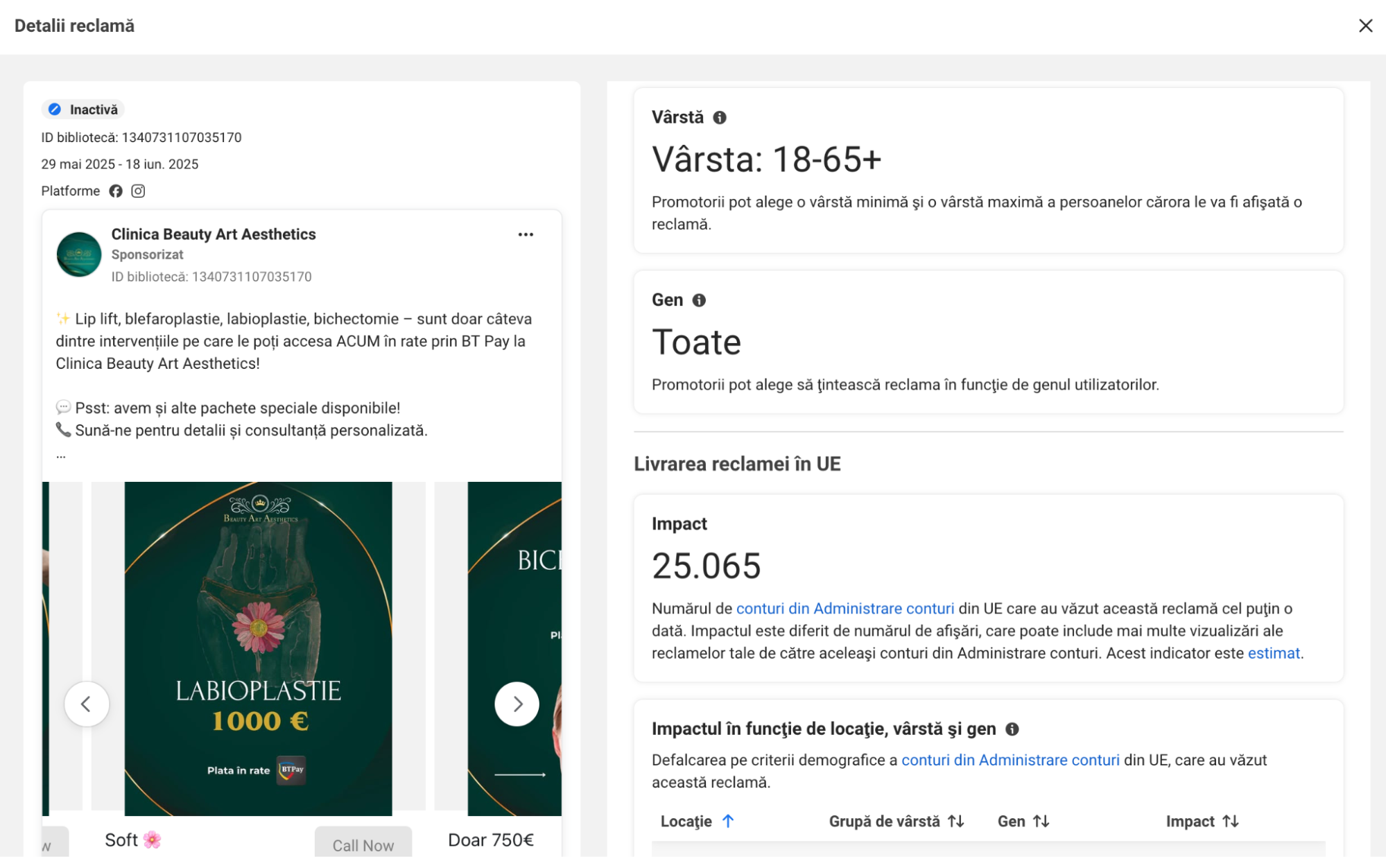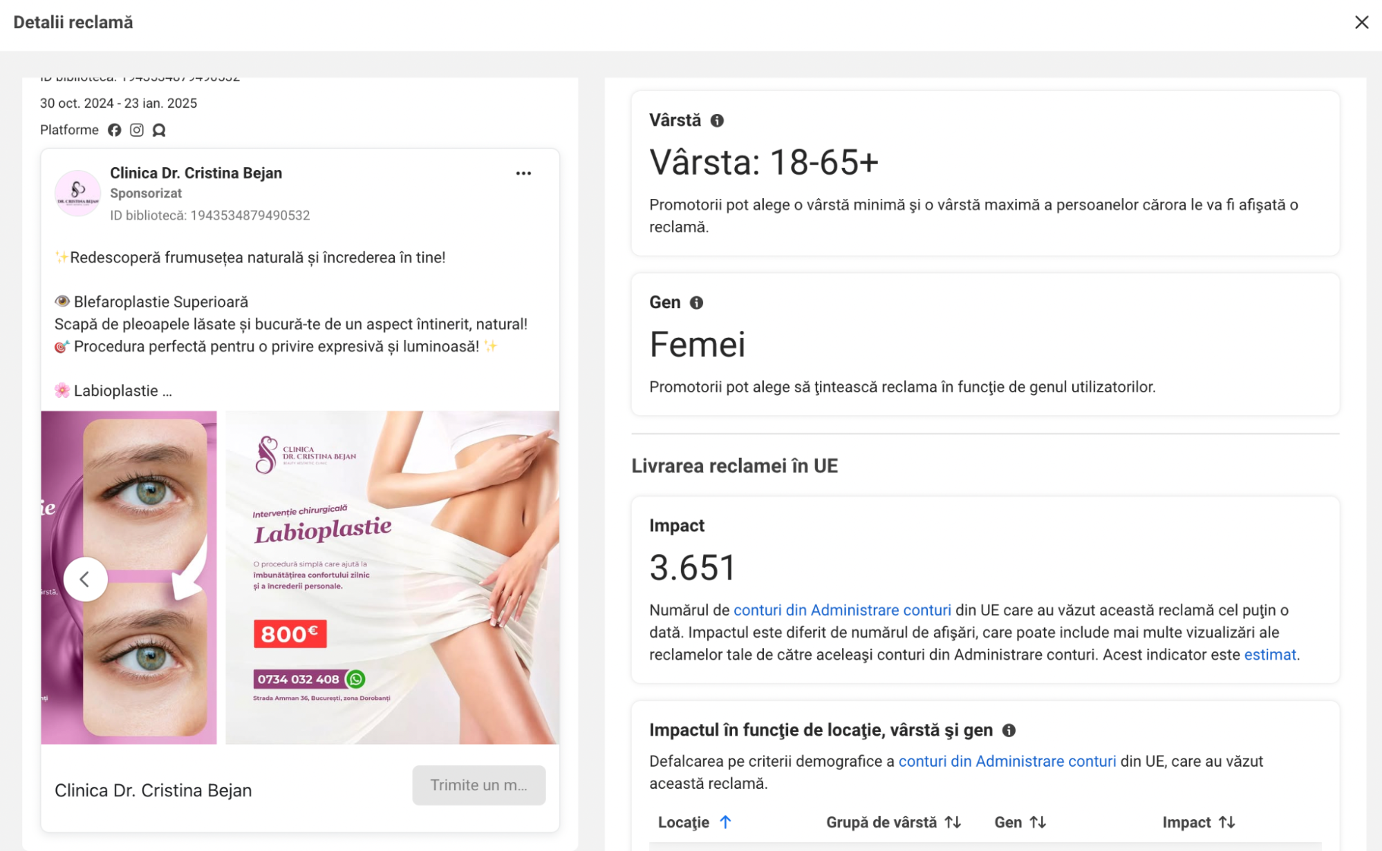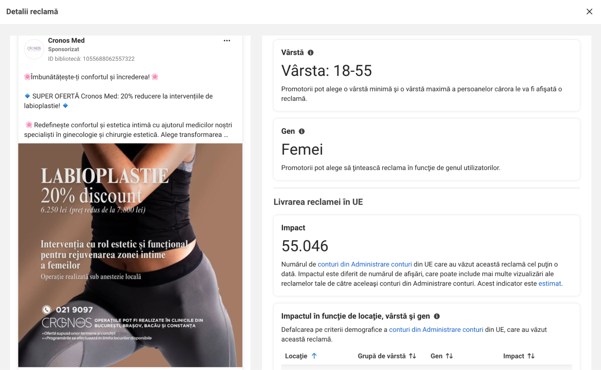 Printre ele, o pagină a unei clinici de recuperare după naștere a plătit ca să-i împingă algoritmii o postare despre un podcast. Tema: incontinența urinară și rolul PRP vaginal. Invitată, Andreea Borislavschi, medic ginecolog la Spitalul Elias, în secția condusă de doctorul Radu Vlădăreanu, un nume cu greutate în ginecologia din România. Ca să încurajeze participarea, există și un premiu special: Giveaway pentru o norocoasă participantă – o ședință gratuită de PRP vaginal la Spitalul Elias, instituție medicală administrată de Academia Română.