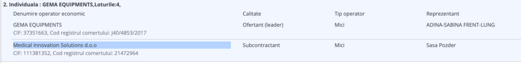 În SEAP, ca subcontractant, mai apare o firmă, denumită Medical Innovation Solutions. Are același nume cu cel al firmei Laurei Galea, prin care cântăreața a livrat roboți Versius la Spitalul Militar la preț de Da Vinci, despre care Snoop a scris recent. Firma Laurei Galea și-a schimbat numele din Celestial Records (înregistrări audio/muzicale) în Medical Innovation Solutions, în noiembrie 2022.