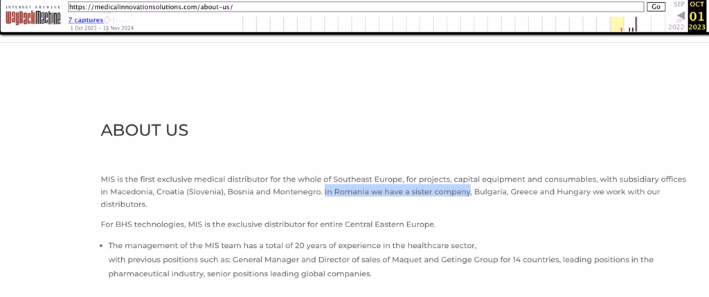 În acest moment, site-ul sârbilor de la Medical Innovation Solutions nu mai este funcțional. Însă, cu ajutorul Wayback Machine, Snoop a găsit mențiuni din 1 octombrie 2023, în care firma spunea că este „primul distribuitor medical de proiecte, echipamente și consumabile, exclusiv pentru Europa de Sud-Est” și are filiale în Croația, Slovenia, Macedonia, Bosnia și Muntenegru.
