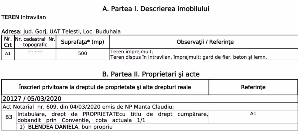 Blendea este cea care deține terenul. Conform extrasului de carte funciară, pe terenul de 500 de metri pătrați nu apare vreo construcție, ci doar că este împrejmuit.