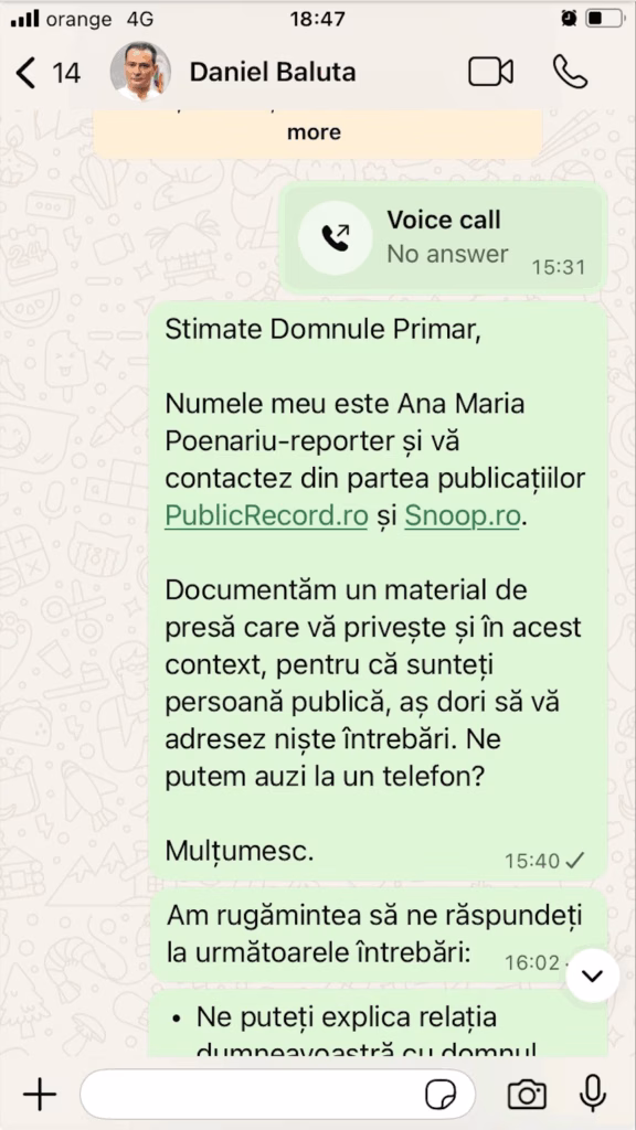 Apoi, Băluță a primit întrebările pe WhatsApp, pe SMS și pe e-mail. Reporterul Ana Poenariu a sunat-o și pe Violeta Boerescu, responsabila de comunicare din primărie, însă nici aceasta nu a răspuns.