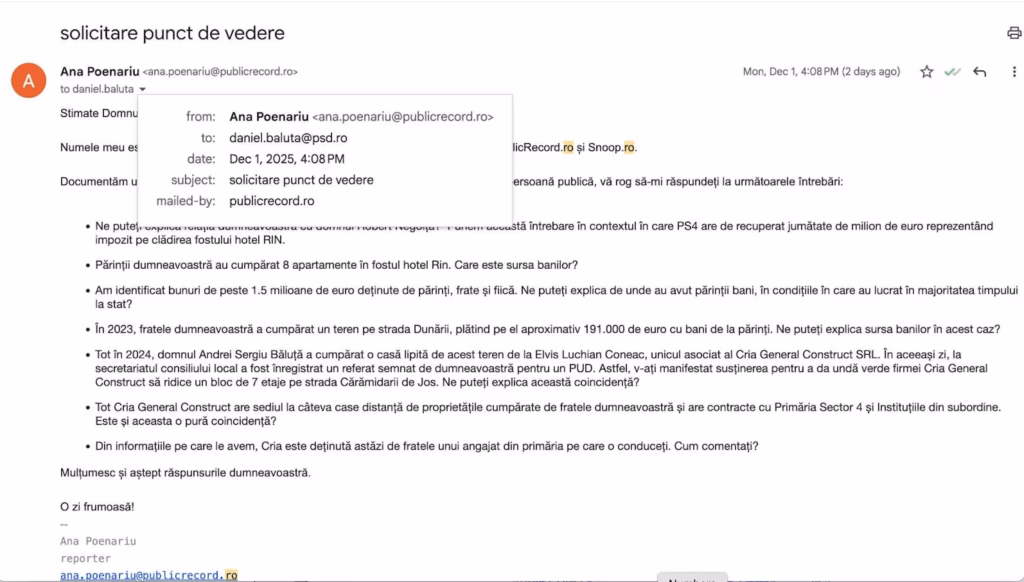 Publicațiile Snoop și Public Record l-au contactat pe Daniel Băluță luni, 1 decembrie, înainte de publicarea din 2 decembrie. Primarul Sectorului 4 a fost mai întâi sunat pe telefonul mobil, atât direct, cât și pe aplicația WhatsApp, la orele 15:28 și 15:31.